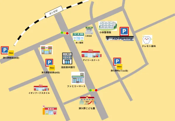 JR阪和線「津久野駅」から徒歩4分の立地にあります。医院前に専用駐車場も完備しています。地域の皆さまが気軽に立ち寄れるよう、落ち着いた雰囲気の外観で、初めての方にもわかりやすい歯科医院です。