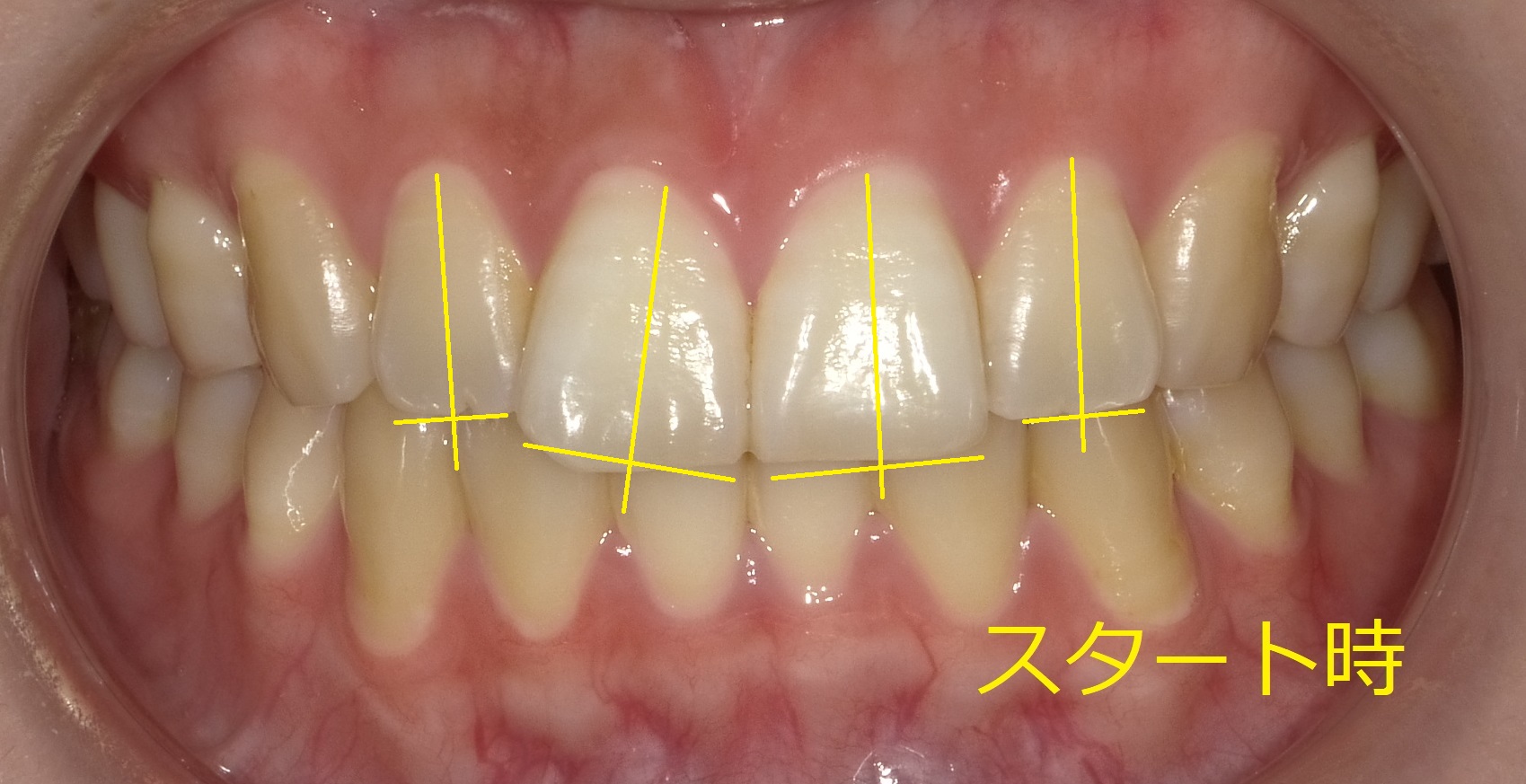 加えて、並んだ時に前歯の傾き(現時点で軸がズレている状態で先端の並びがそろってしまっている)を修正する必要があります。