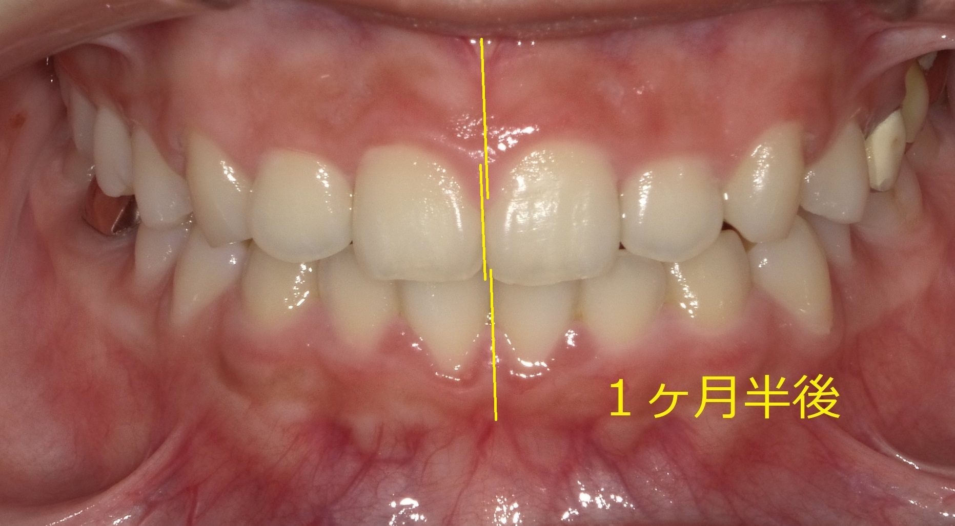 顎のスジ、上下の前歯のラインを引くと、まだ上の前歯が右寄りなのが顕著です。(↓写真)