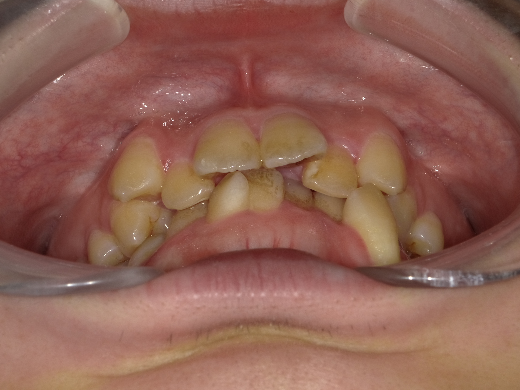 いわゆる「乱杭歯」「重なりが強いガタガタ」の歯並びです。