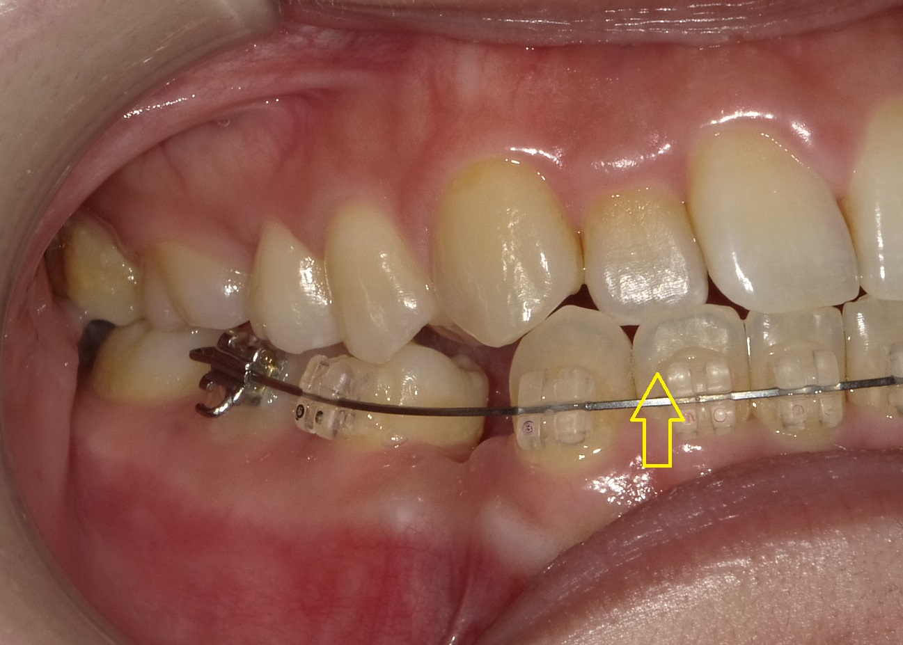 矢印の交差している部分は勿論まだまだ改善はしておらず、その引っ掛かりを無視して下の前歯を後ろに引いているため、下の前歯に多少の隙間が出来ています。