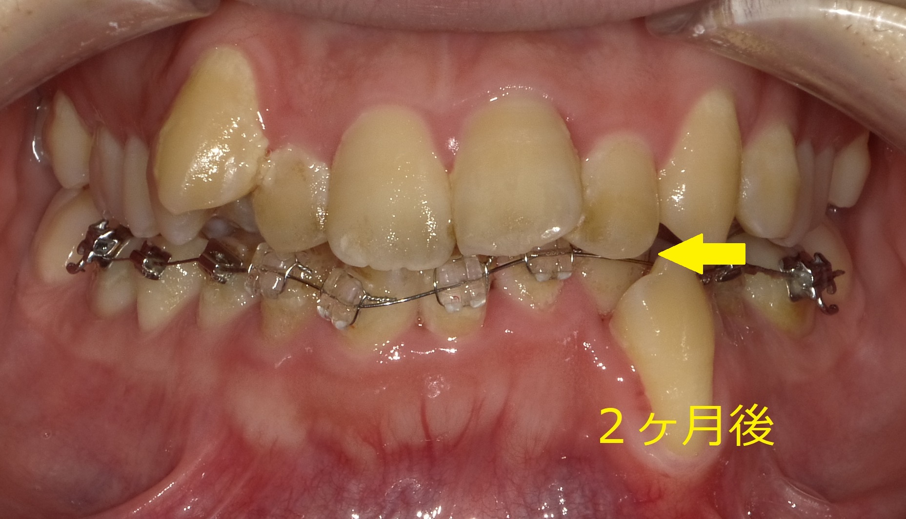 この2ヶ月は奥歯を広げることをメインにしているので前歯の状態にあまり変化は見られませんが、元々左上の2番目と下の八重歯が噛み合っていたのが下の写真の矢印のように、奥歯が立ち上がることによって当たらなくなってきています。