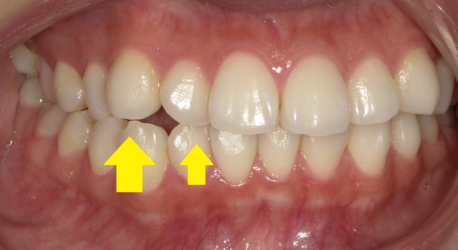 そのため右の2、3番目の歯がしっかり噛み合わず隙間が生じている反面、反対側はしっかり噛んでいるように隙間がありません。