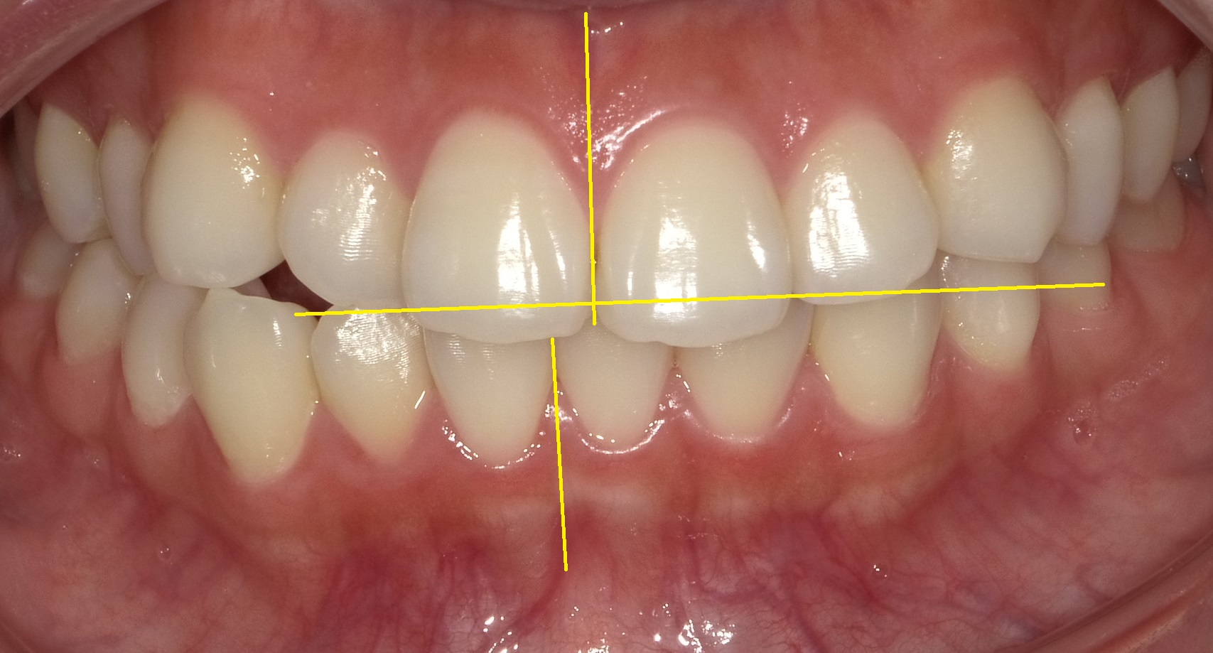 とにかく右上の歯が引っかかり、そこを中心として右回転を起こしているため、上の写真の通り、下の顎は右側にズレ(前歯の中心が上に比べて5mmほど右側)、噛み合わせの平面も傾いてしまっています。