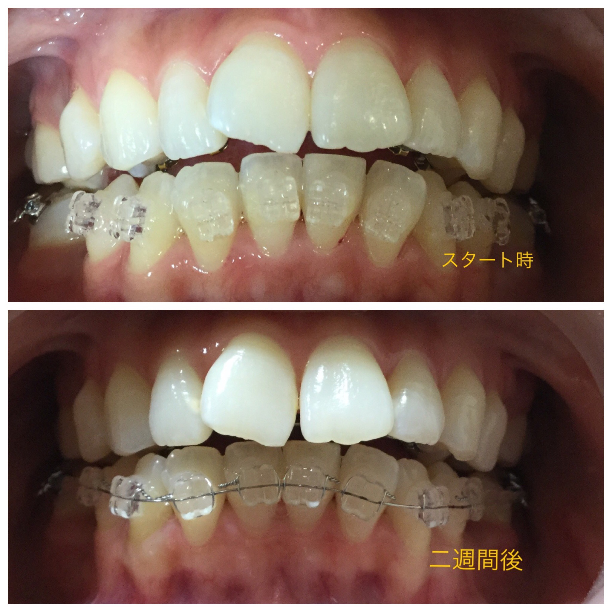 2週間前の状態で右上の前歯に器具を取り付けることも出来るのですが、隙間=動くスペースのため、スペースがある状態で動かしたほうが歯の移動がラクなため、器具に不要な力が加わり外れてしまったり、歯の痛みが出たりというトラブルが防げます。