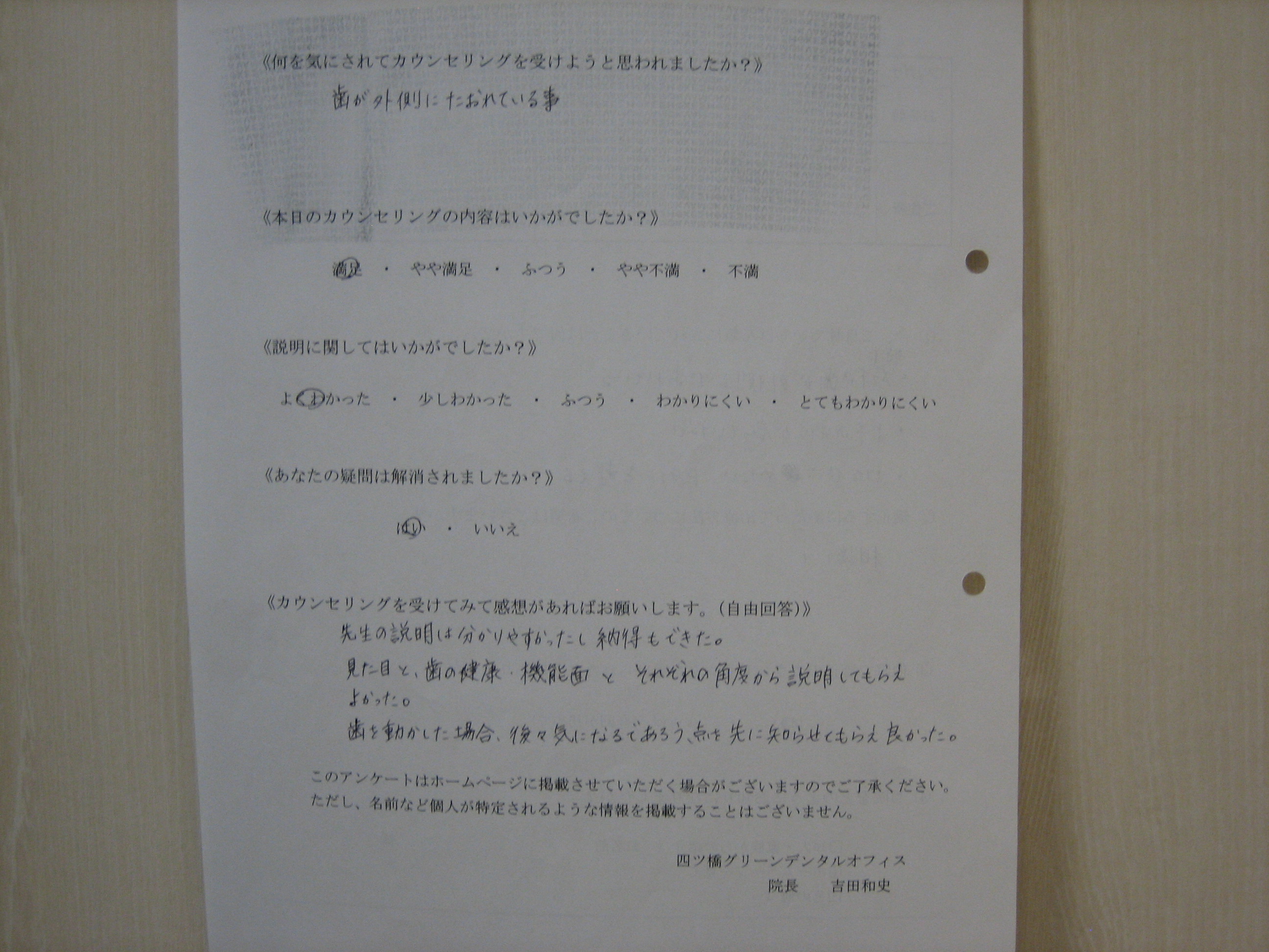 カウンセリング後アンケート ⑲|四ツ橋の歯医者「四ツ橋グリーンデンタルオフィス」|四ツ橋駅徒歩2分の医院ブログ