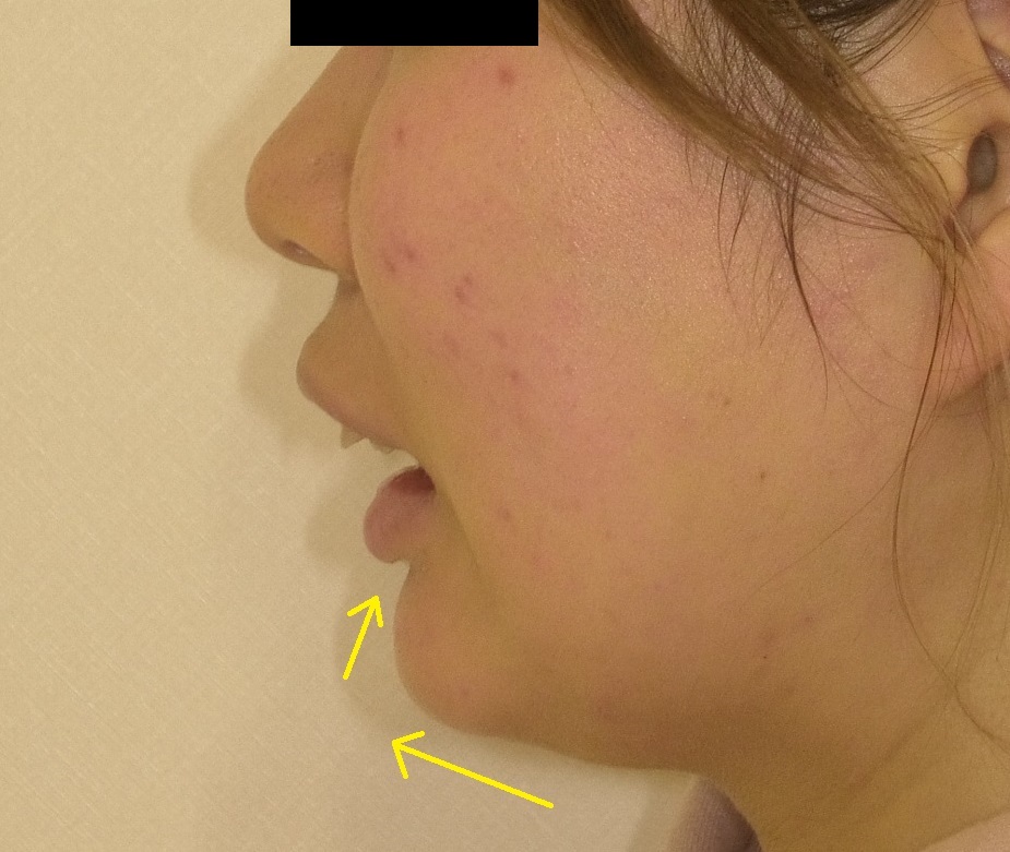 主に下の奥歯が倒れていて下顎が深く噛み過ぎていて、矢印のように顎が上を向いている+唇を押し込んでいるような状態です。