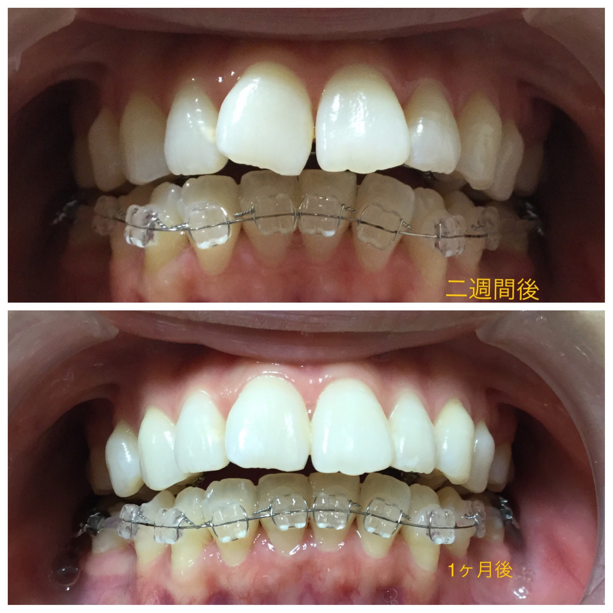 前回スペースを作った右上前歯に器具を付けて並べていく処置をしたのですが、その結果がこちらです。