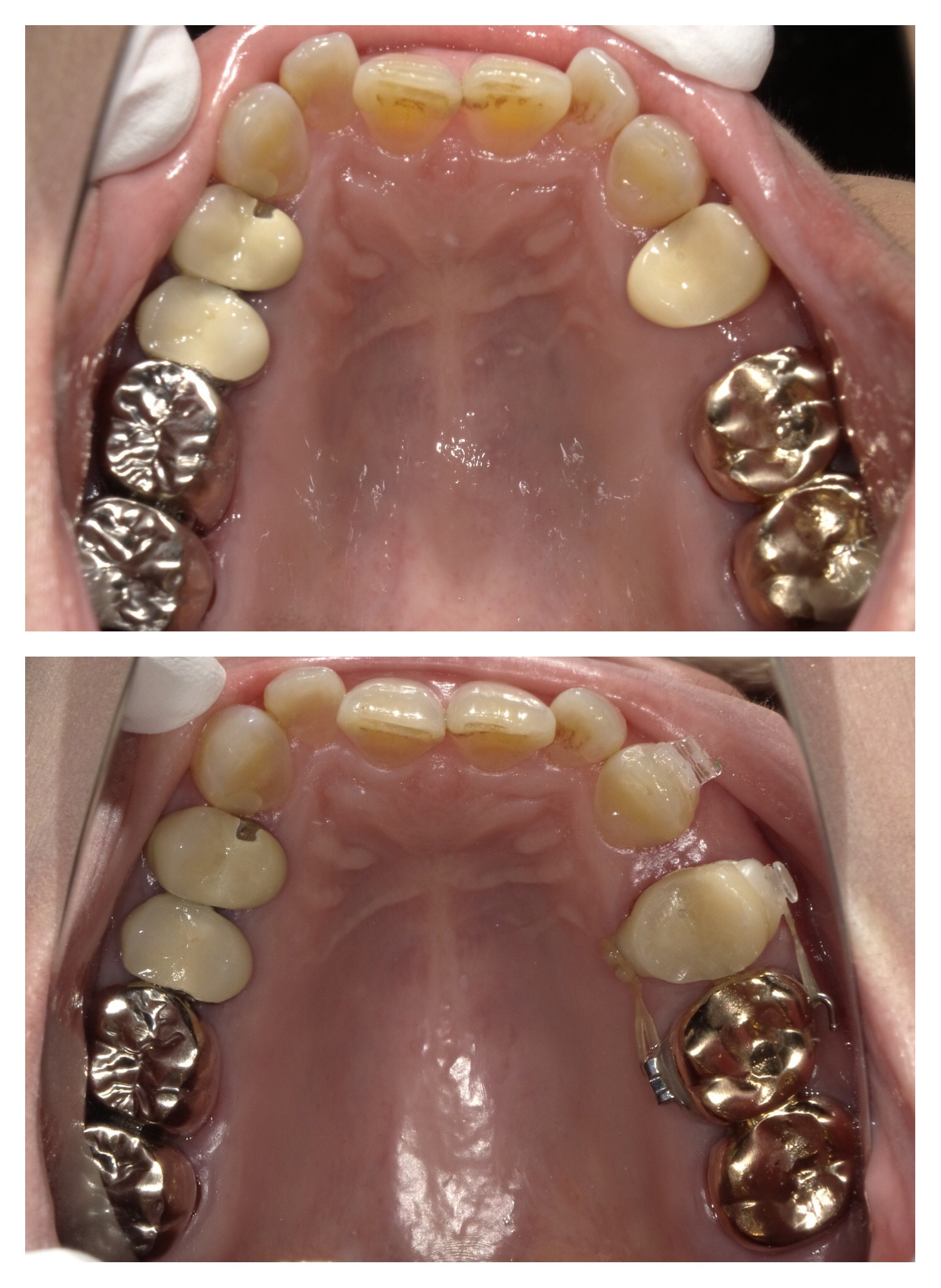 今回は、移動予定の④番目の歯が根っこを治療した後の仮歯の状態だったため、咬む面をツルツルにすることで咬み合せの引っ掛かりをなくし、移動しやすくしています。