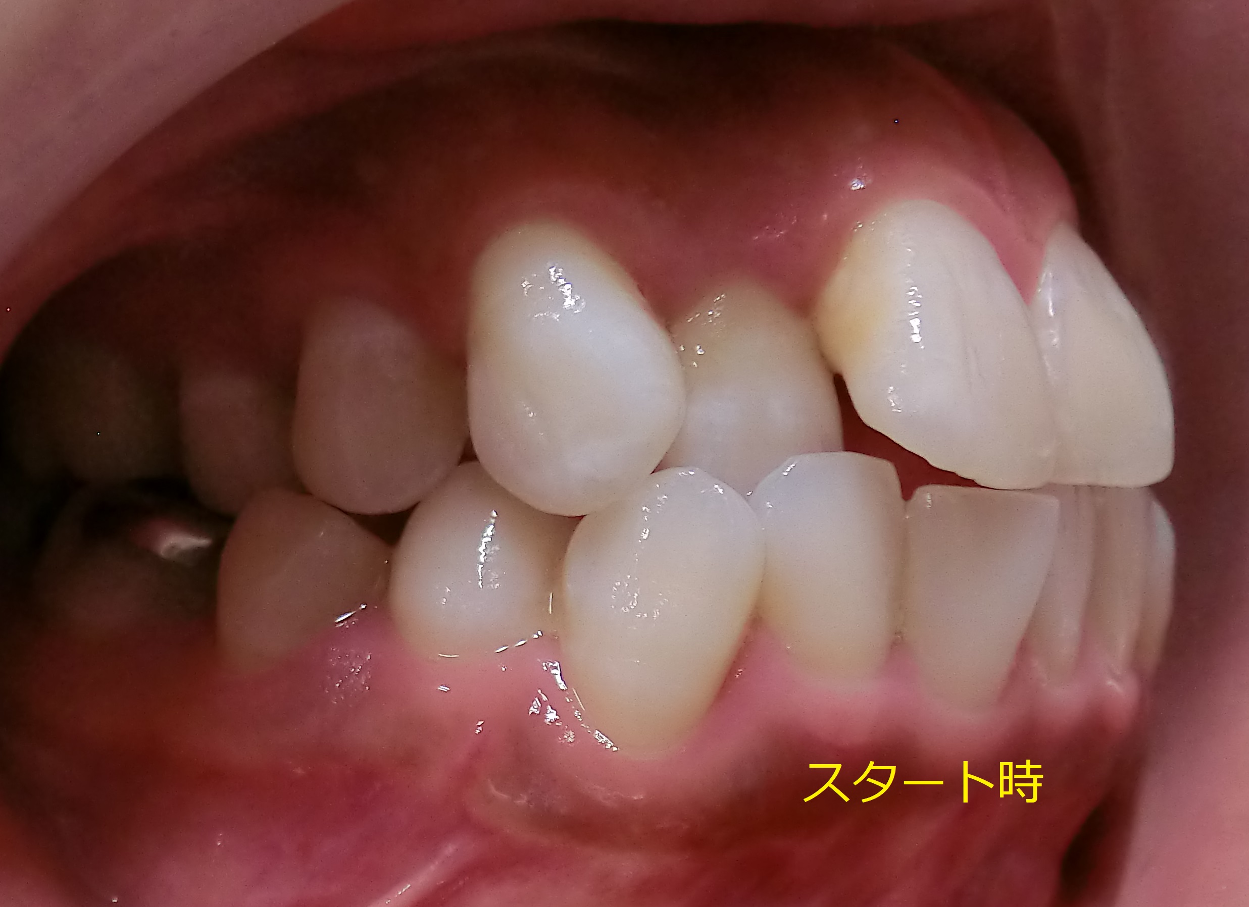 横からみると、上の2番目の歯とのかみ合わせの関係上、下の歯が前方に引っ張られて受け口っぽくなっているのが分かります。