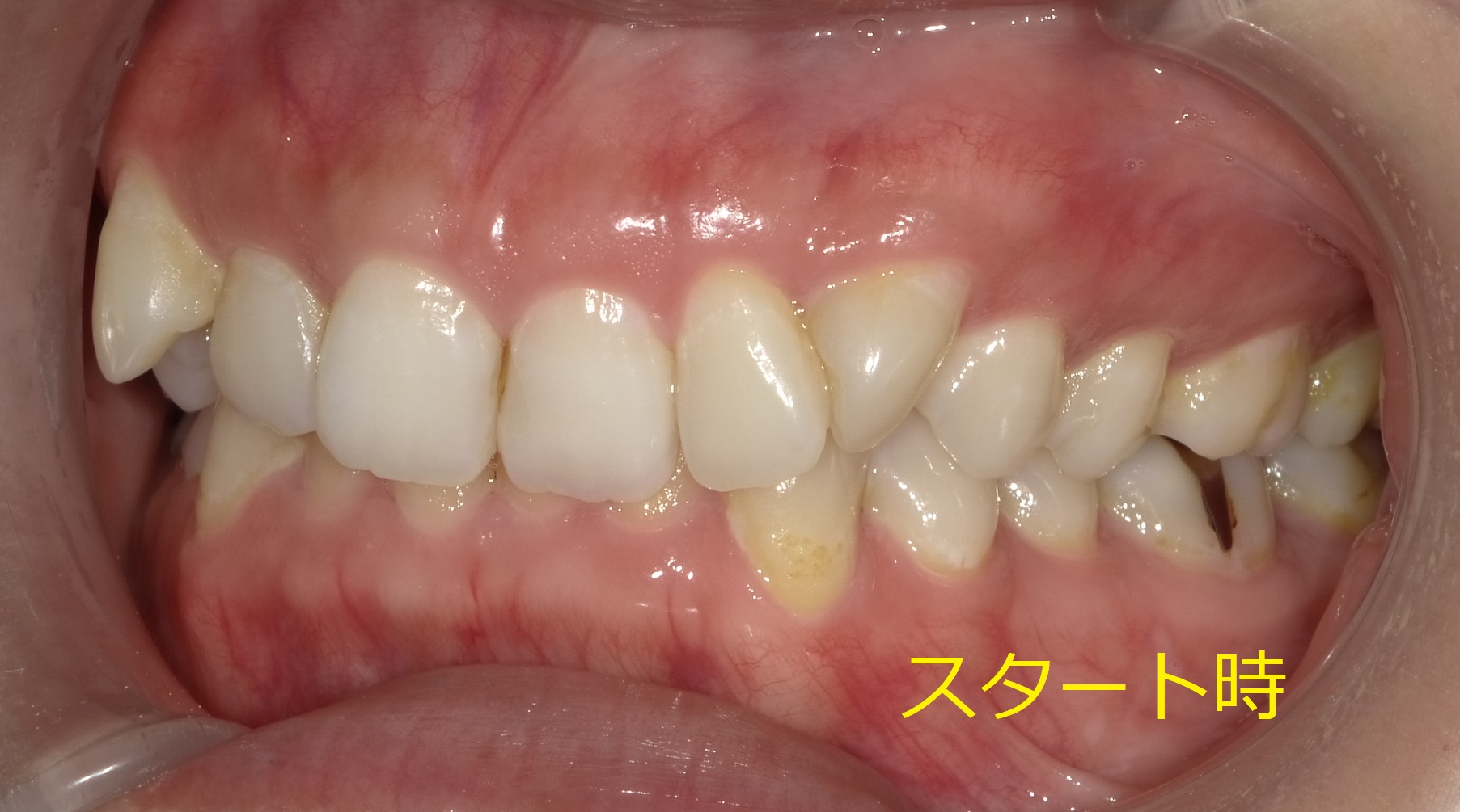 横から見ると、前歯が内側に倒れこんでいる+歯茎が出ていることによる存在感(前歯の根っこが出ているため)が確認出来ます。