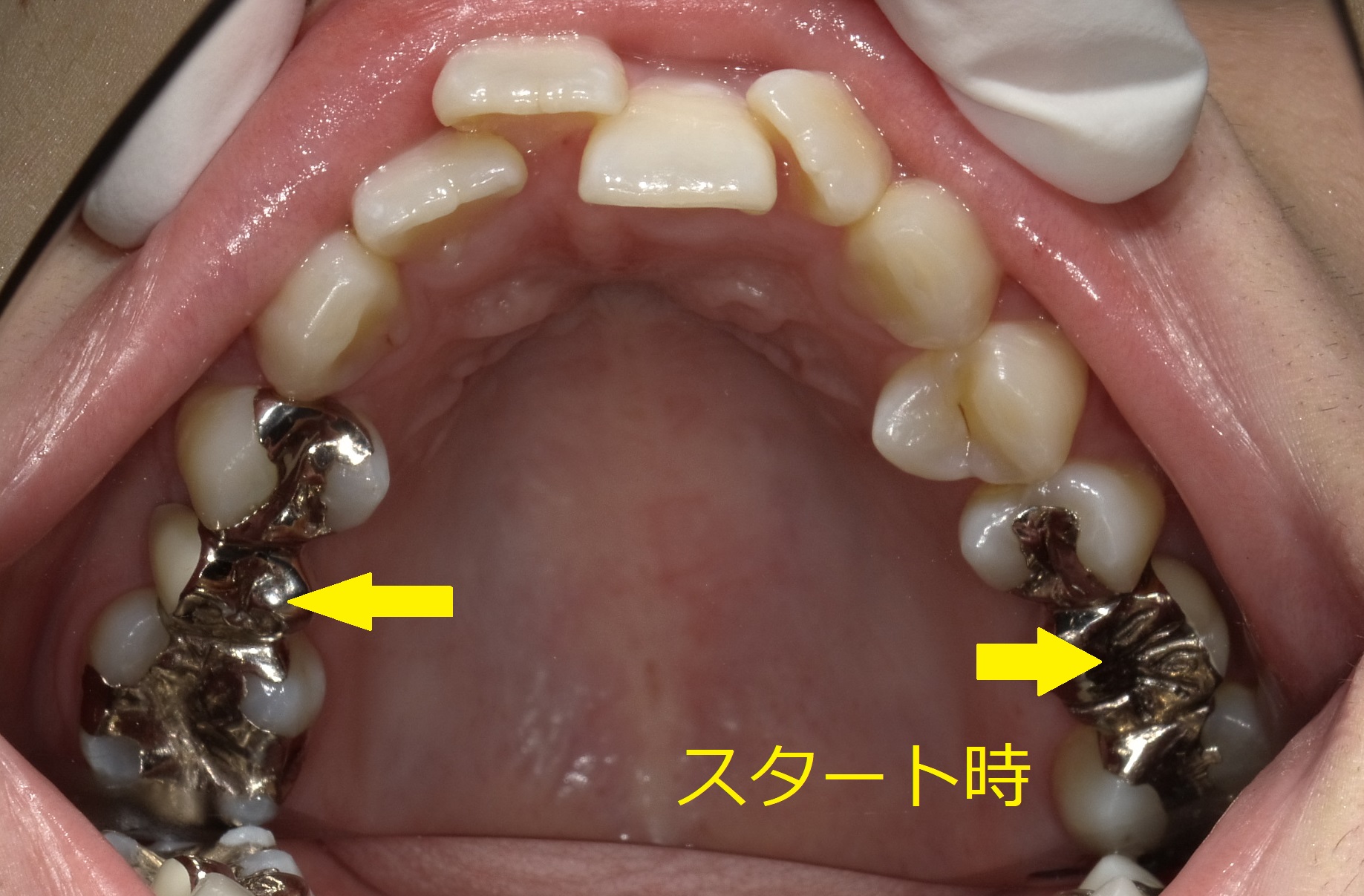 本来は大きく歯を削るか、抜くかを選択しなければいけないのですが、黄色の矢印の部位が虫歯で喪失し、ブリッジが入っている状態なので今回はこのスペースを利用して前歯の重なりを取っていくことにします。