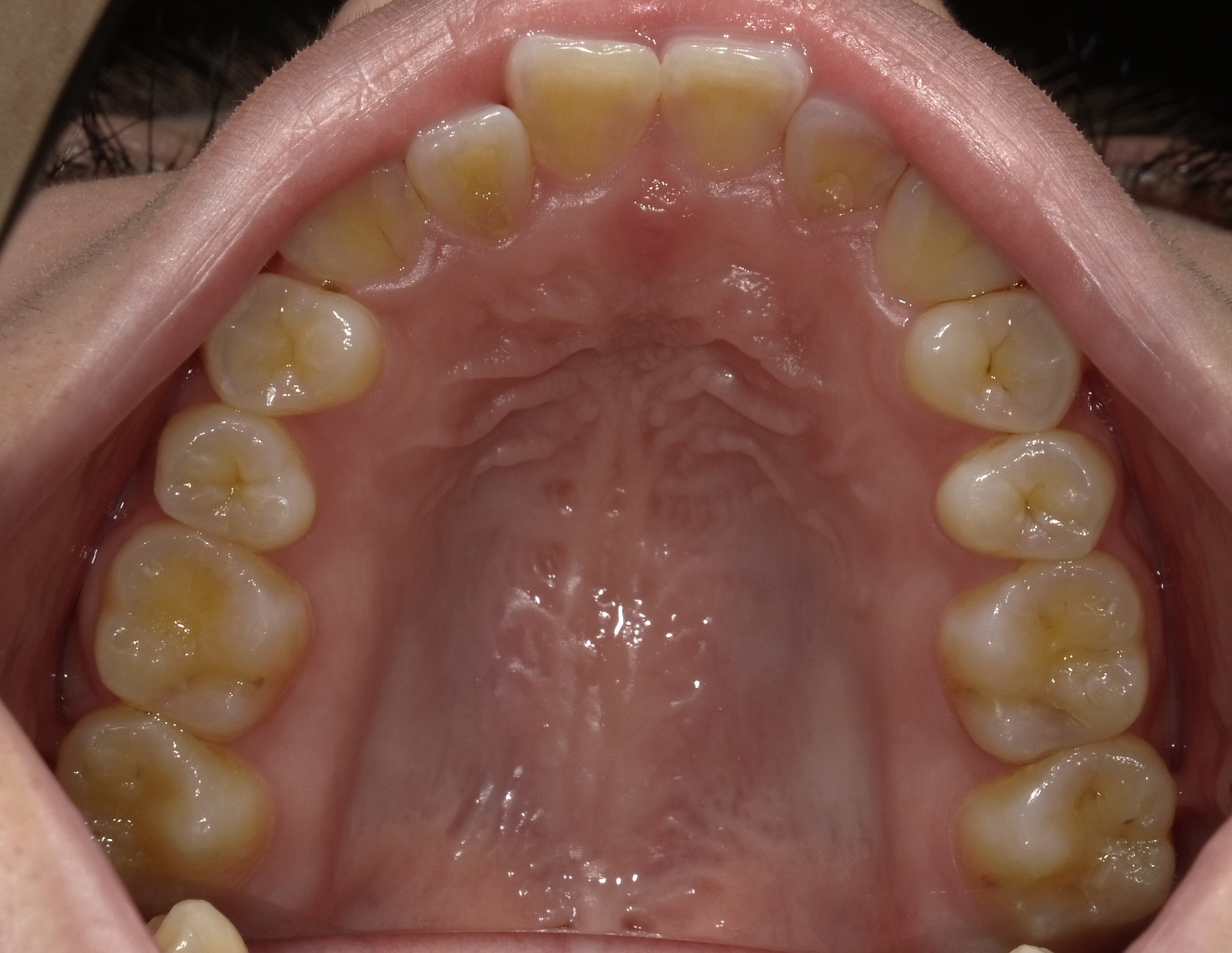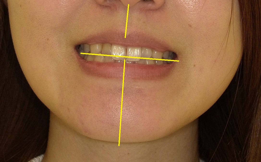 正面からの写真のとおり、右上の2番目の歯が噛んだ状態で下の前歯より口の内側に入ってしまっているため、全体的にかみ合わせが右にズレ、顎も右に歪んでいるように見えます。