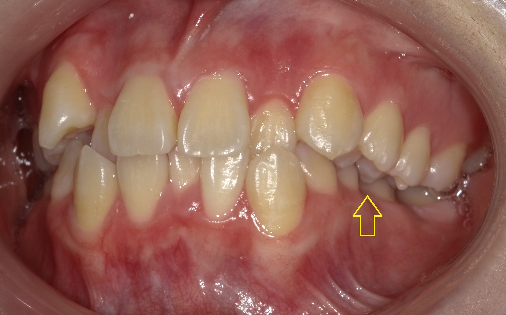 写真のとおり、①八重歯を目立ち、②上の2番目の歯が下の前歯に対して内側に傾いて、全体的にバラついているのですが、一番の問題は、