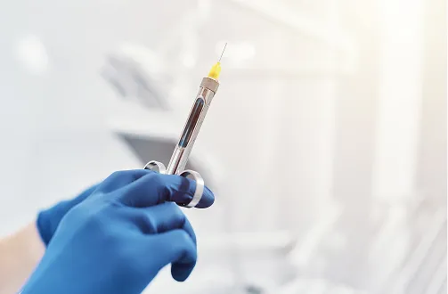 「歯科治療でよくあるイヤなこと」のひとつに、麻酔を注射する際のチクッとした痛みを挙げる患者さんは多くいらっしゃいます。麻酔を打つ場所に、前もって表面麻酔という"塗る麻酔薬"を塗布することで、注射針の痛みを軽減することができます。