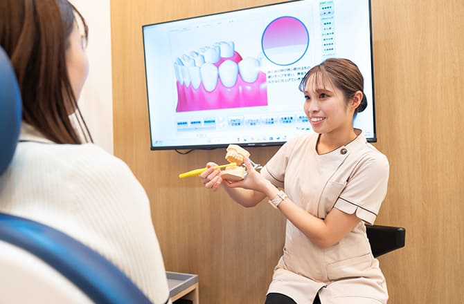 当院では担当歯科衛生士制を採用し、毎回同じ歯科衛生士が継続して患者さまを担当します。同じ担当者が診ることで、微細な変化も見逃さず、よりきめ細やかなケアを提供できます。