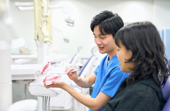 一人ひとりのお口の状態に合わせたブラッシング方法を丁寧にアドバイスします。染め出し液を使って磨き残しを確認し、歯ブラシの当て方や動かし方を実際に練習していただきます。さらに、歯間ブラシやデンタルフロスの使い方も指導し、毎日のセルフケアの質を高め、虫歯や歯周病を予防します。